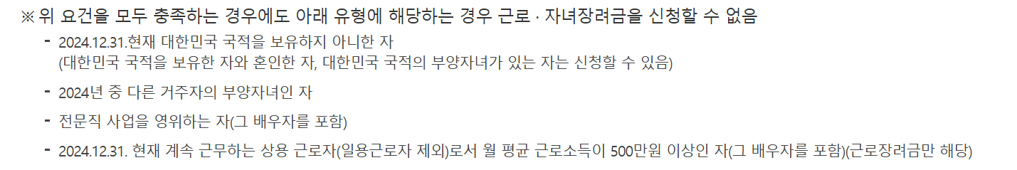 대한민국 국적이 아니거나, 다른 사람의 부양자녀인 경우, 전문직 사업자 또는 고소득자라면 신청할 수 없습니다.