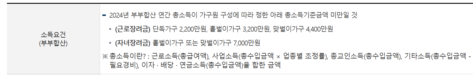 소득, 재산, 가구 유형, 대한민국 국적 등 몇 가지 조건들을 충족해야 합니다.